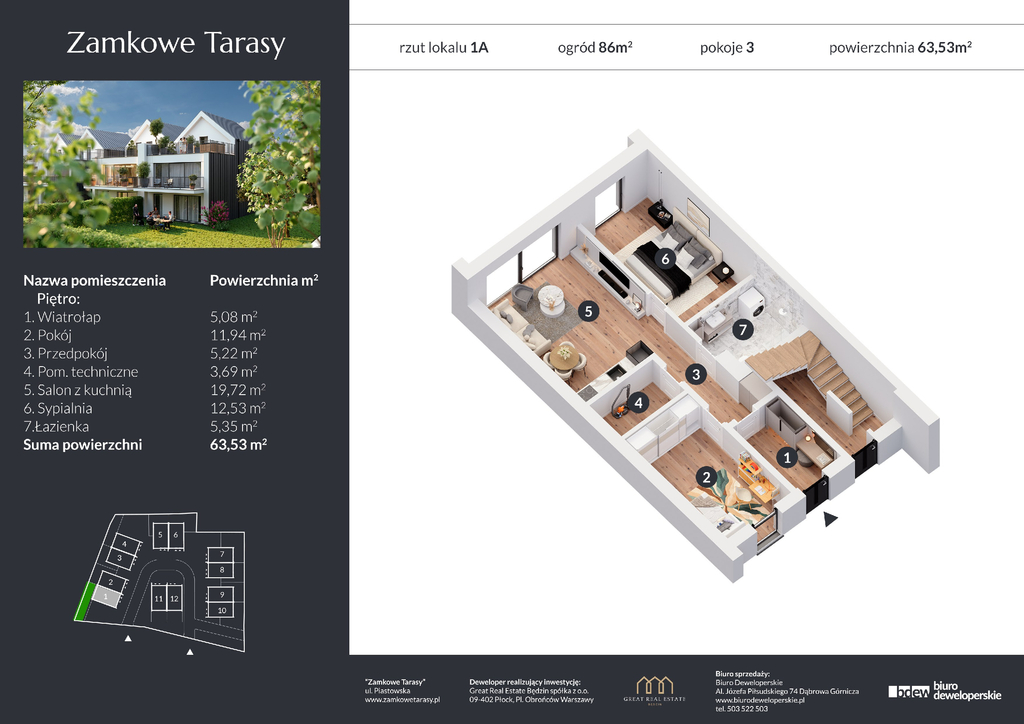 Przedmiotem oferty jest apartament o powierzchni 63,53 m2 z przynależnym ogrodem 86 m2 oraz miejscem postojowym położony na parterze, na nowym osiedlu Zamkowe Tarasy w Będzinie przy ul. Piastowskiej.