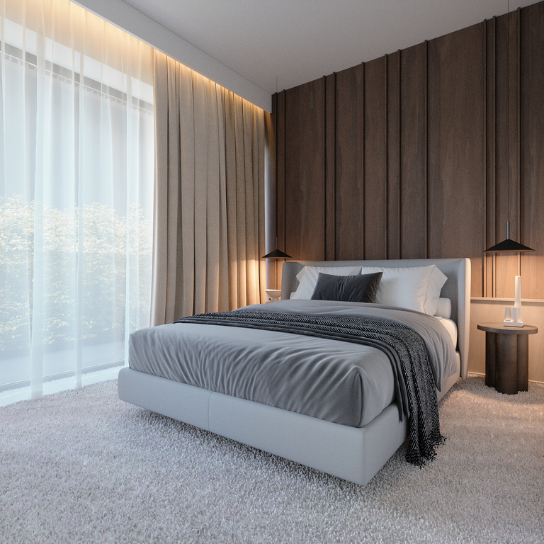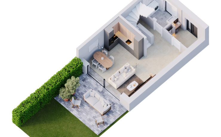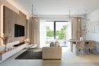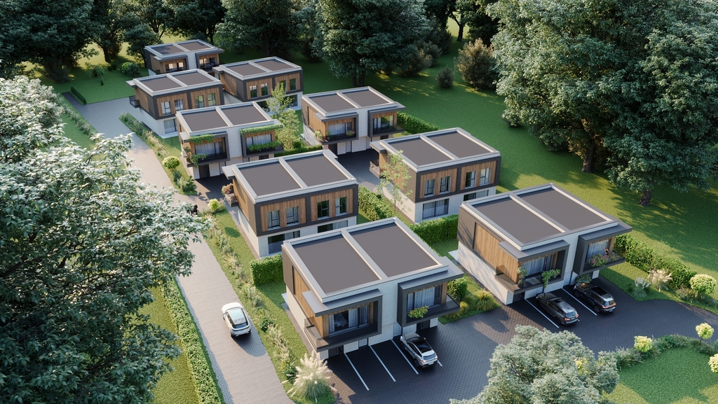 Każdy dom oferuje starannie przemyślany układ pomieszczeń, zapewniający wyraźny podział na reprezentacyjną strefę dzienną oraz prywatną część wypoczynkową. Duże przeszklenia doświetlają wnętrza naturalnym światłem, a bezpośrednie wyjście do ogrodu pozwala płynnie połączyć przestrzeń domu z otoczeniem zieleni.