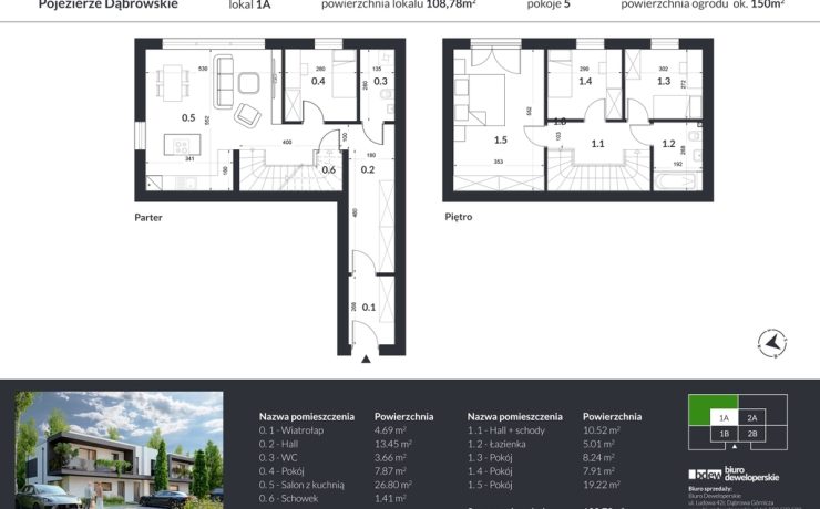 Parter: wiatrołap, hall, toaleta, pokój, schowek, strefa dzienna z aneksem kuchennym