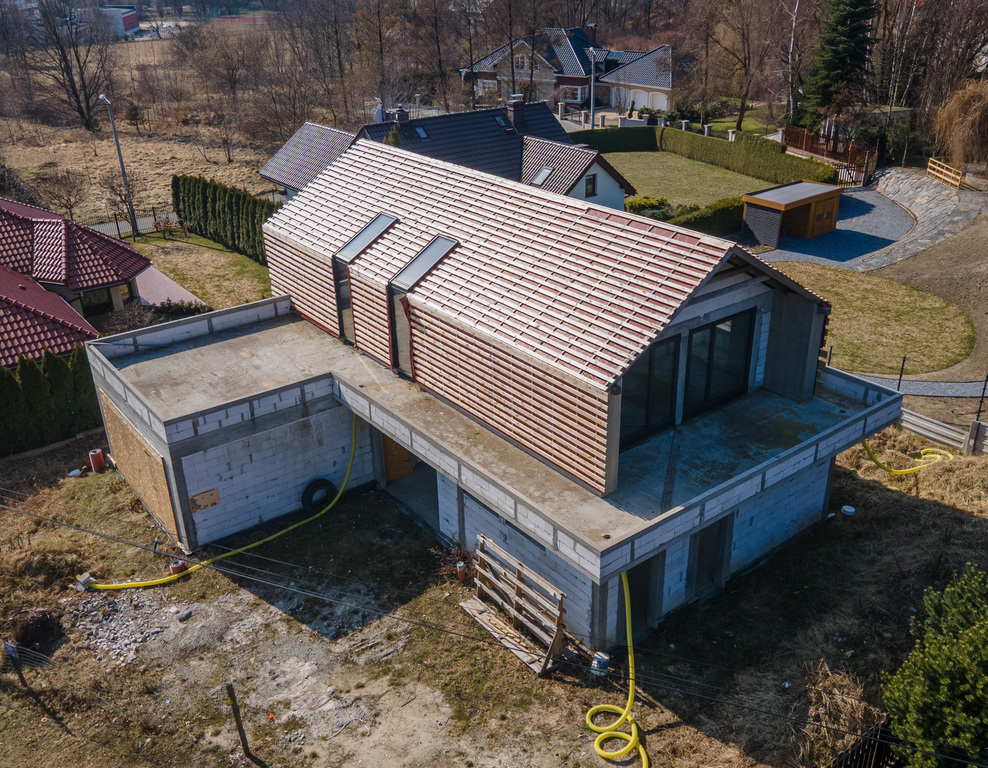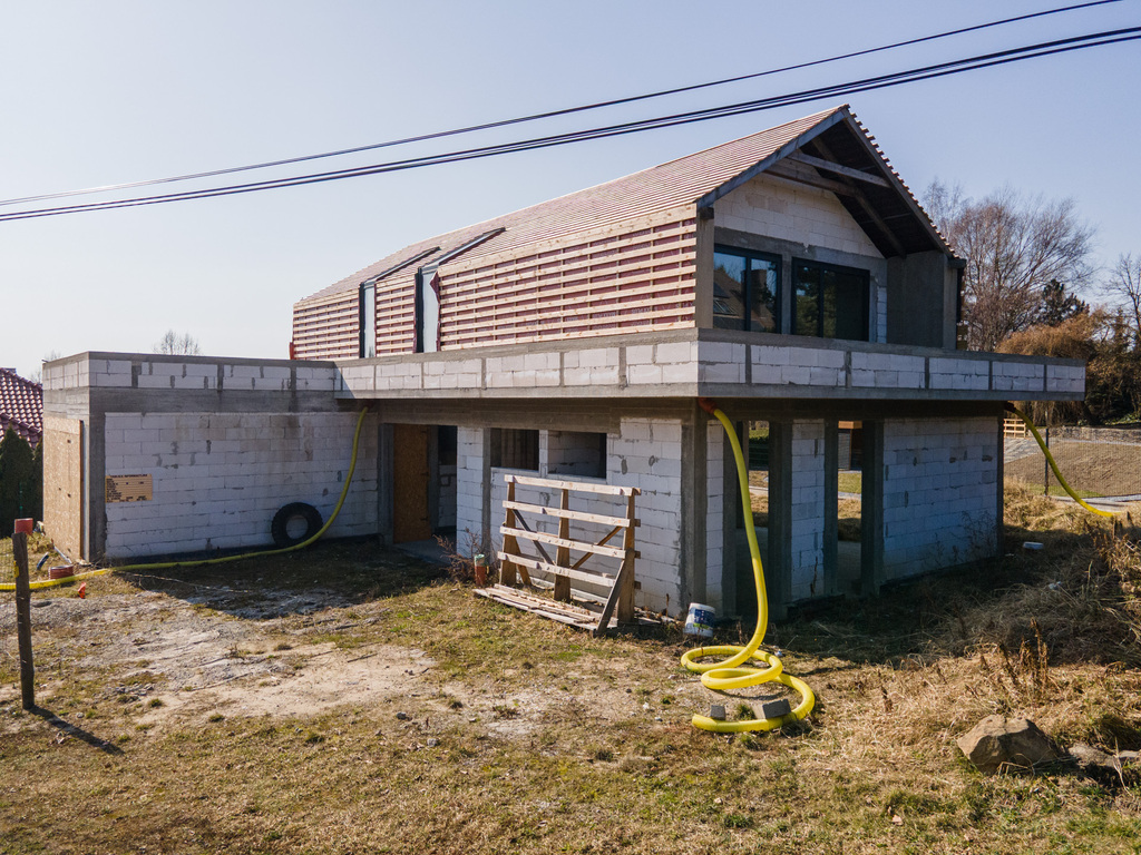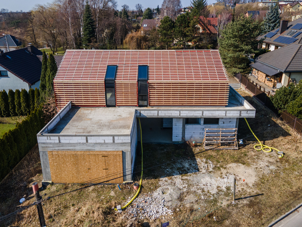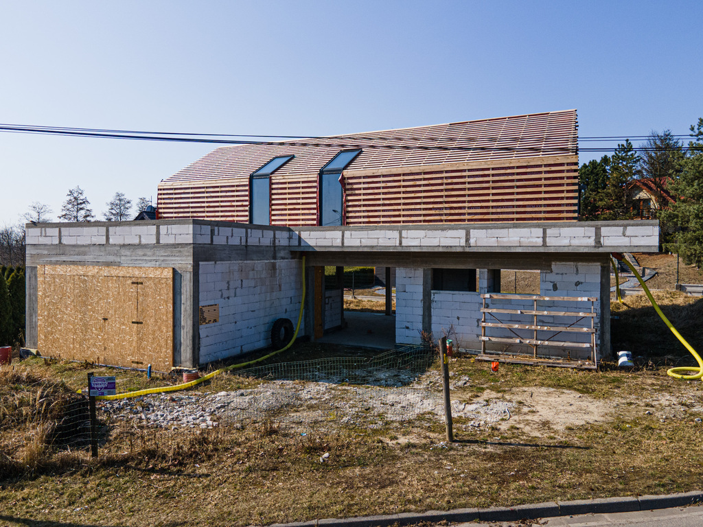Dom wybudowany został w technologii tradycyjnie, posadowiony na ławach fundamentowych. Ściany zewnętrzne i wewnętrzne wykonane z betonu komórkowego. Dach w konstrukcji drewnianej, kryty blachą na rąbek. Dom będzie doprowadzony do stanu surowego zamkniętego. Na terenie działki znajduje się studnia deszczowa.