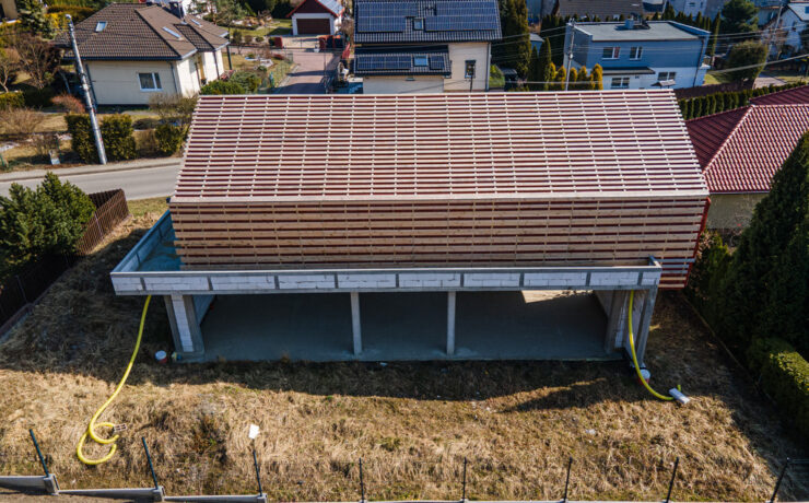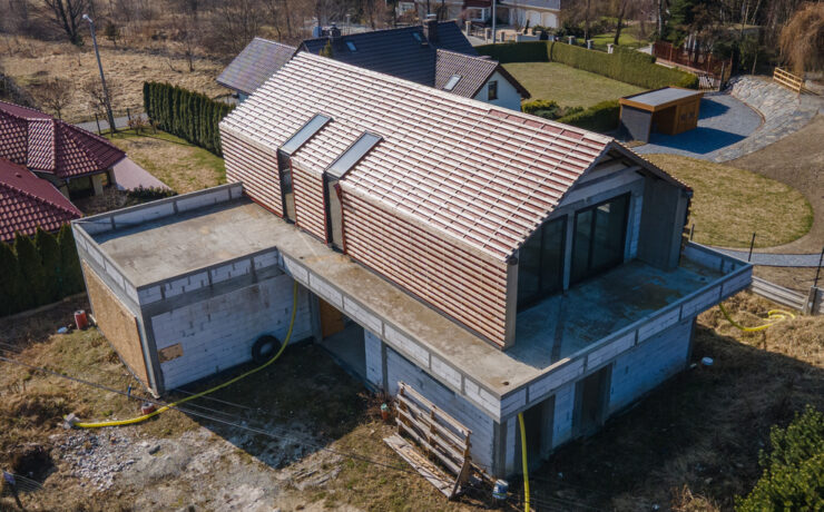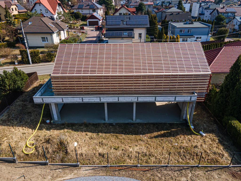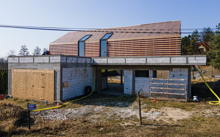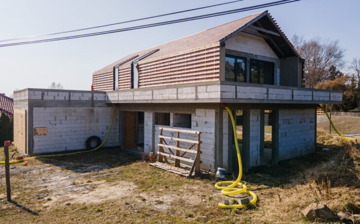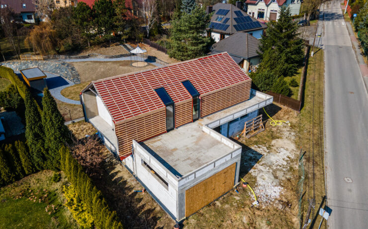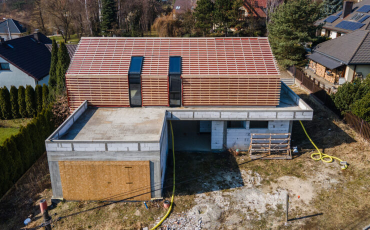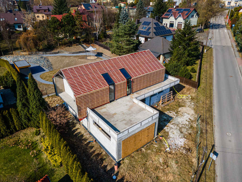 Dom wybudowany został w technologii tradycyjnie, posadowiony na ławach fundamentowych. Ściany zewnętrzne i wewnętrzne wykonane z betonu komórkowego. Dach w konstrukcji drewnianej, kryty blachą na rąbek. Dom będzie doprowadzony do stanu surowego zamkniętego. Na terenie działki znajduje się studnia deszczowa.