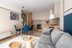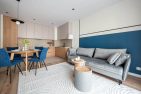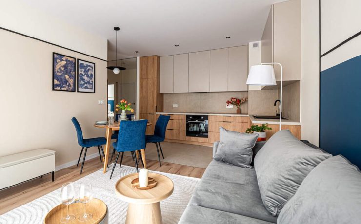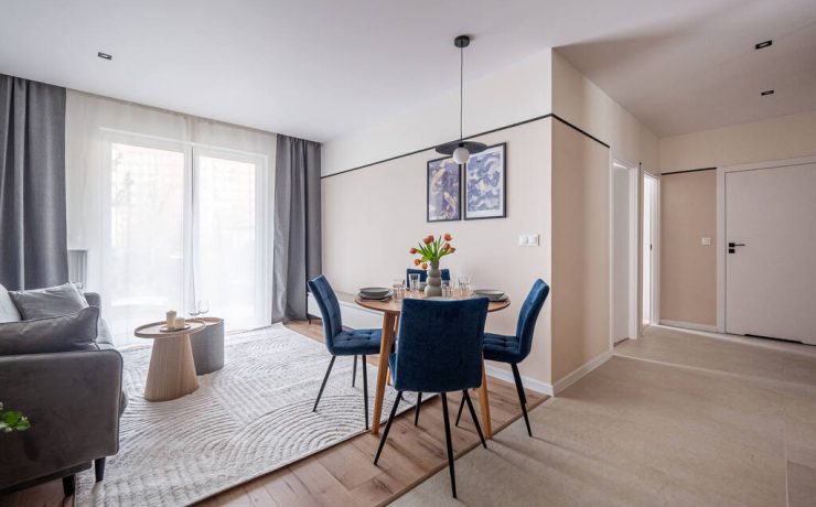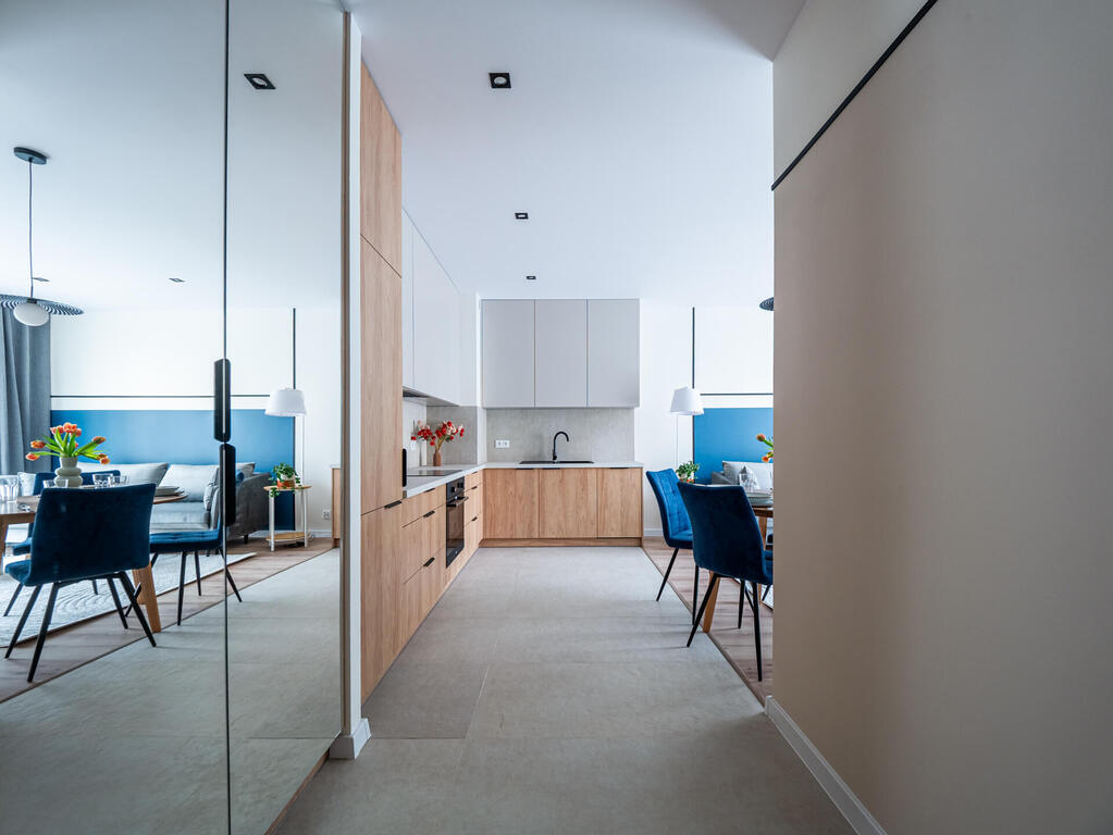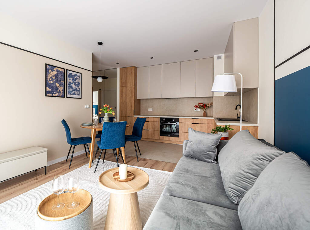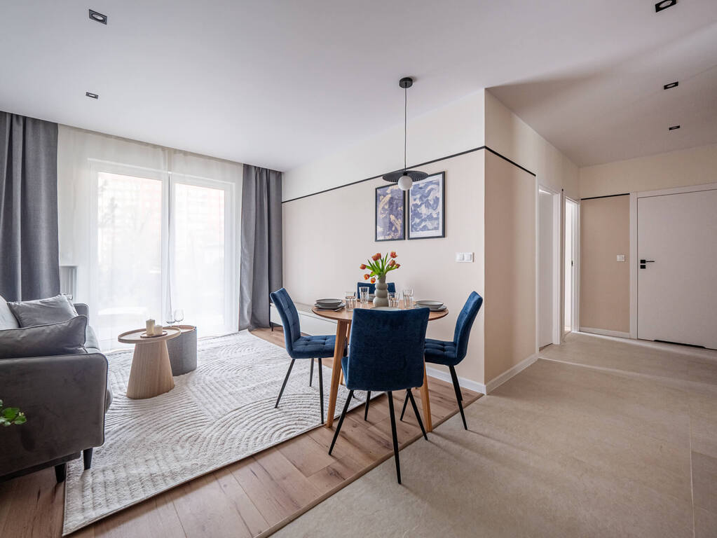Mieszkanie o funkcjonalnym układzie na który składa się: przedpokój, przestronna część dzienna z otwartą kuchnią oraz wyjściem na balkon, łazienka, w pełni umeblowana sypialnia oraz jeden pokój do własnej aranżacji. Kuchnia w pełni wyposażona w zabudowy meblowe oraz sprzęty AGD. W łazience znajduje się pralka oraz zabudowa meblowa, która zapewnia miejsce do przechowywania. Na podłogach w pokojach znajdują się panele oraz płytki ceramiczne. W całym mieszkaniu zabudowy meblowe zostały wykonane na wymiar co zapewnia pełne wykorzystanie przestrzeni oraz dużą ilość miejsca do przechowywania. Mieszkanie wykończone z dbałością o detale.